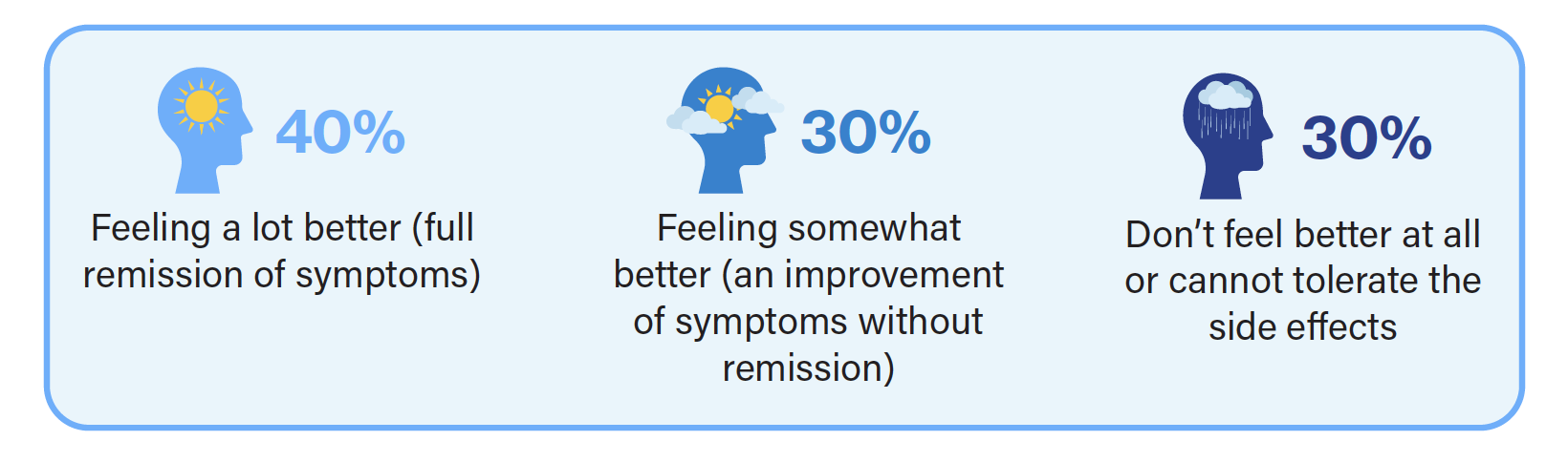 Antidepressants help many people with depression and anxiety feel better. But they don’t work for everyone. Some people who take them feel a lot better. They may even see all their symptoms go away. Others feel only somewhat better. And some either don’t feel better at all or cannot tolerate the side effects. The likelihood of each of these different types of responses to an antidepressant is shown here:3-5