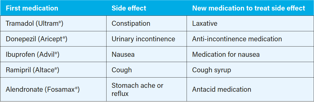 Whenever you take a medication, there is a risk you will experience a side effect. The more medications you take, the greater your risk of side effects. Whenever you experience new symptoms, you and your health providers should always first consider whether they could be caused by medications you are currently taking. This will help avoid a common preventable problem called a “prescribing cascade”.