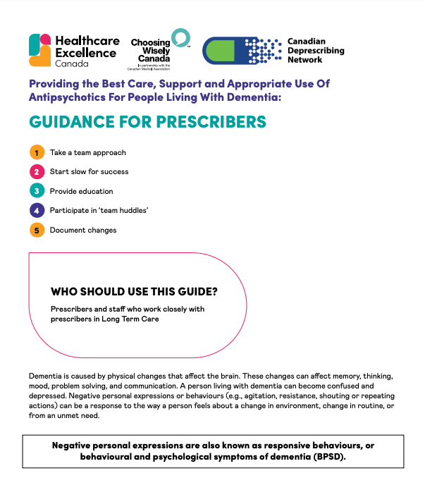 Healthcare Excellence Canada developed a series of resources to inform everyone involved in dementia care about how to effectively address negative personal expressions and behaviours, and how to deprescribe antipsychotics safely.