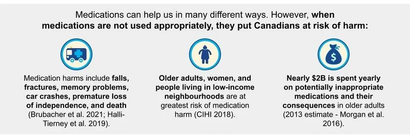 National experts from medical, academic, community and political spheres are worried. They know that too many Canadian seniors take too many medications. What's more, they know an alarming proportion of older Canadians take potentially inappropriate medications—a medication becomes inappropriate when its potential to cause harm outweighs its potential for benefit. Seniors suffer numerous consequences for taking these medications: falls, fractures, hospitalizations and premature loss of independence are only a few examples. The costs are astronomical: collectively we spend an estimated 1.4 billion dollars each year on treating adverse effects caused by potentially harmful medications in older Canadians (Morgan et al. 2016).
