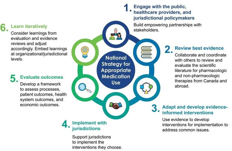 First and foremost, Canada’s medication appropriateness strategy must be informed by real-world research reflecting patients’ lived experiences. At its centre, our strategy proposes a national coordinating organization to implement provincial, evidence-based interventions. This allows both for interventions to be tailored to the needs of each individual province, and also facilitates the rigorous evaluation of outcomes at the patient, system and economic level. An agile strategy would continuously collect, review and learn from real world data.